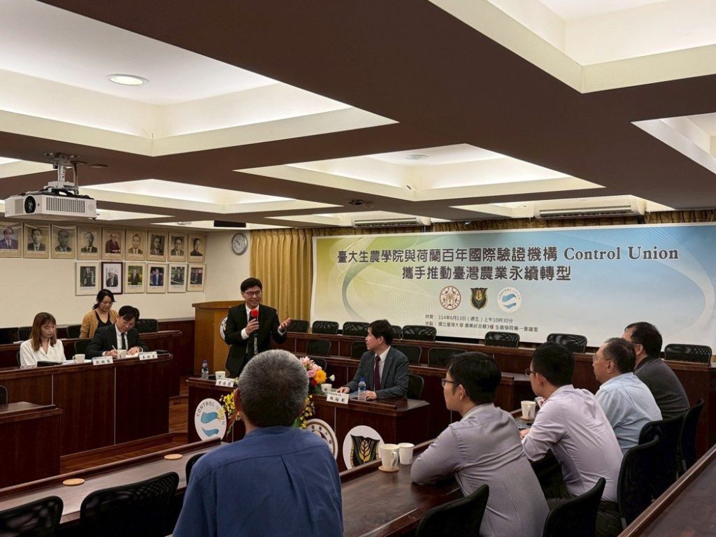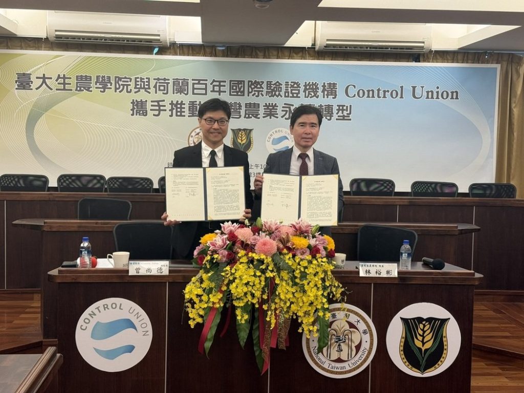 為推動臺灣農業永續轉型,國立臺灣大學生物資源暨農學院於6月13日與荷蘭百年國際驗證機構Control Union(荷蘭彼德森驗證有限公司)正式簽署合作備忘錄(MOU),雙方將共同致力於推動臺灣農業品質提升、國際市場接軌,以及發展永續農業、智慧農業、再生農業與循環經濟等先進技術,攜手引領臺灣農業走向淨零轉型,提升全球競爭力,在國際永續供應鏈中取得先機。