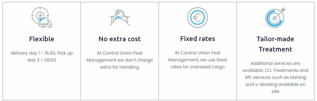 Control Union has been in the global pest management business since early 2016, and has over 100 years’ experience in securing organizations’ vital cargo. Renowned for its innovative and dynamic approach, our group provides clients with high-quality and cost-effective solutions to meet every challenge large and small. We have offered flexible BMSB treatments from the beginning of the scheme. Building on our existing network, client base and presence, we’re continuing to expand our operations worldwide through our port-to-port pest management services. We are also active in sectors such as (organic) bulk commodities treatments and rodent and mouse control. Control Union has offices in more than 70 countries. Please don’t hesitate to reach out to us if you have any questions, we are happy to help you with all kinds of questions.
